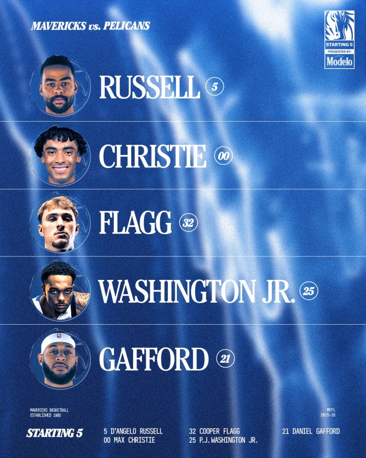 Clay becomes a substitute for the first time in his Mavericks career! Changes: Russell starts, Flagg returns to No. 3