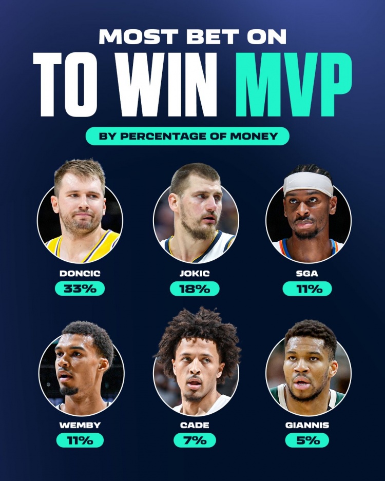 Doncic is the most favored! Among the new season MVP betting, Doncic has the highest betting amount, accounting for 33%.