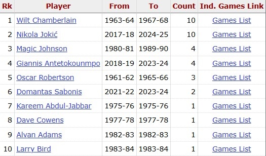 For the 11th time, Jokic scored 30+ triple-double with a 70+% shooting rate, surpassing Chamberlain and ranking first in history.