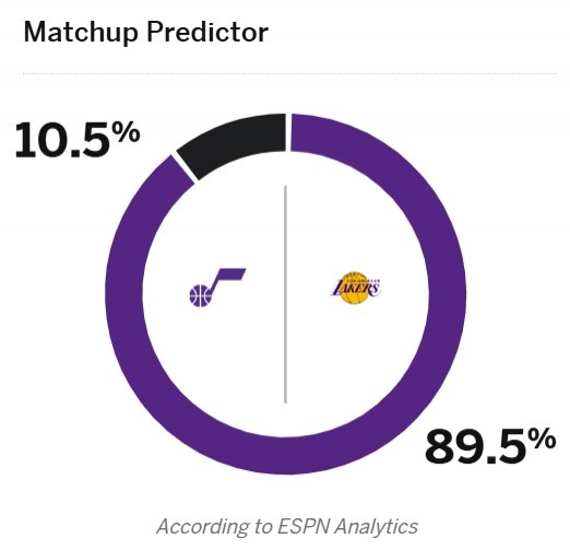 ESPN predicts that the winning rate of this game will be 89.5% for the Lakers and only 10.5% for the Jazz.