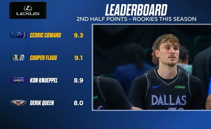Rookie second half scoring average this season: Coward leads with 9.3 points, Flagg ranks second with 9.1 points