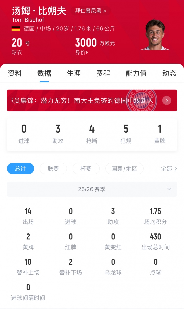 20-year-old Bayern star! Bischof scored a long-range shot in the U21 European preliminaries, and has contributed 3 assists in 14 appearances this season.