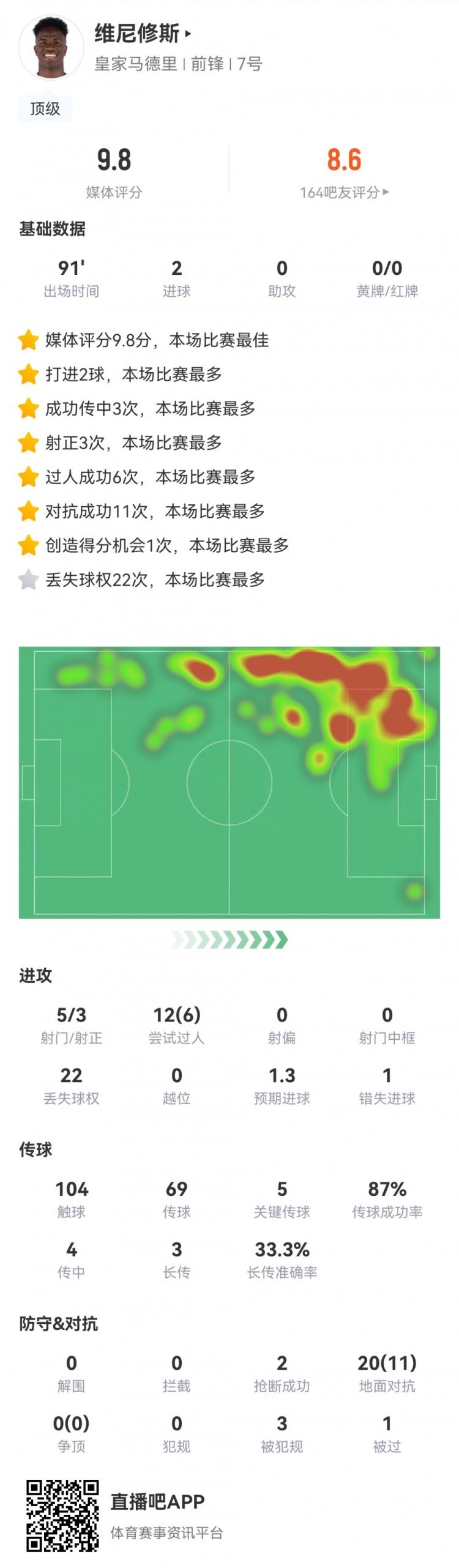 Almost full mark! Vinicius data: 2 goals scored 104 touches 5 key passes scored 9.8