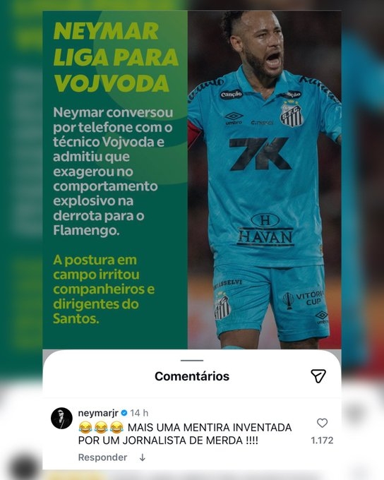 After the end of this round of the Brazilian League, some media reported that Neymar had taken the initiative to contact coach Wojvoda and admitted that his excessive behavior in the loss to Flamengo was indeed excessive. In response to this, Neymar responded directly in the comment area of ge News Network's Instagram tweet: "This is another lie made up by a rubbish reporter."