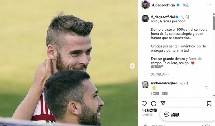 Not long ago, De Gea updated social media to pay tribute to Alba, who announced his retirement after the end of this season. The two were once teammates of the Spanish national team.