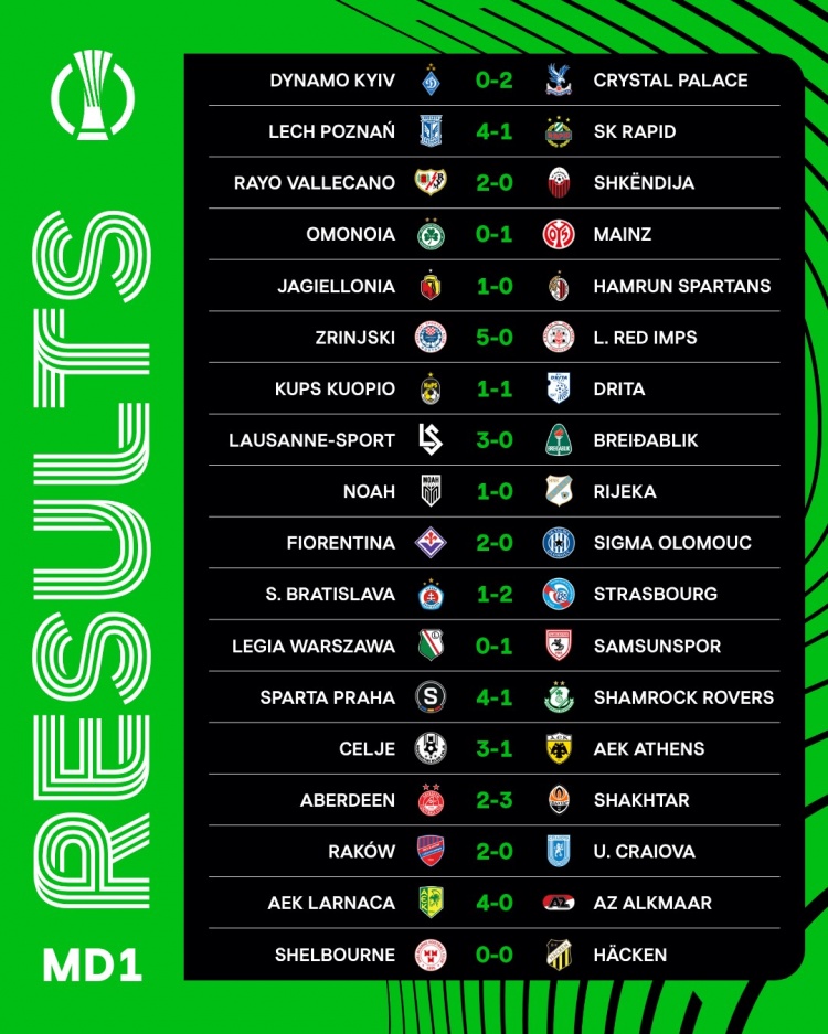 Europa League first round results: Crystal Palace 2-0 Dynamo Kiev, Vallecano and Fiorentina win