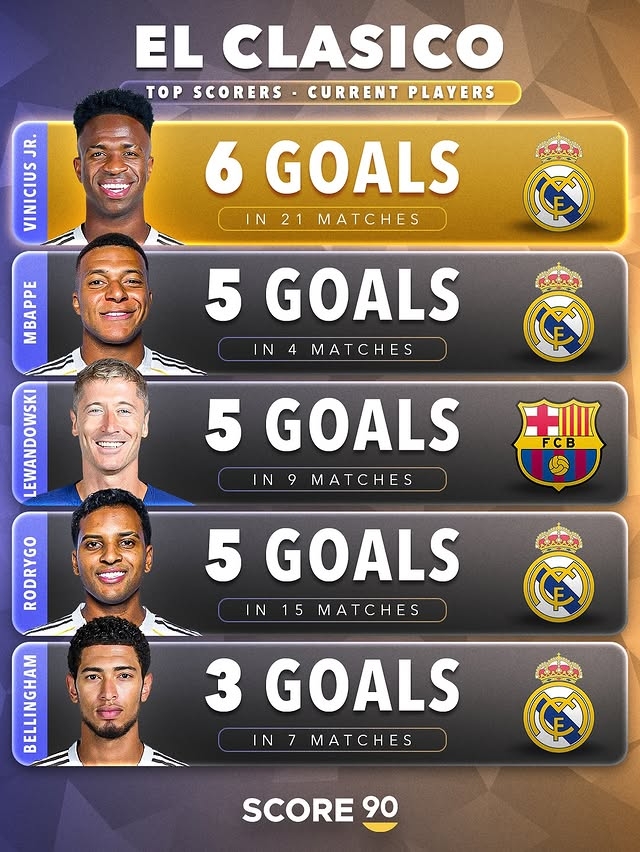Among the current national derby scorers, Vinicius leads the list with 6 goals, Mbappe, Lewandowski, and Rodrygo are tied for second with 5 goals, and Bellingham has 3 goals. There is also only one Barcelona player in the TOP5.