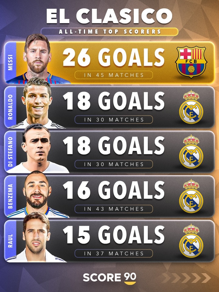 In the historical scorer list of El Clasico, Messi is far ahead with 26 goals, Cristiano Ronaldo and Di Stefano are tied for second with 18 goals, Benzema has 16 goals, Raul has 15 goals, and there is only one Barcelona player in the TOP5.