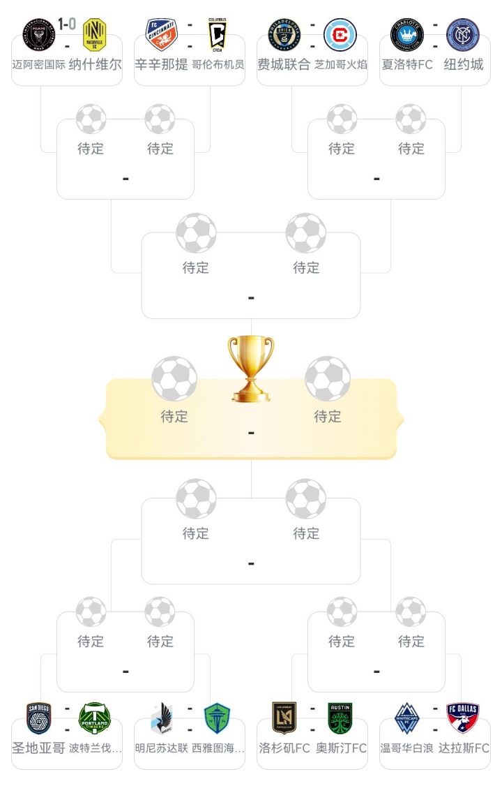 In the Eastern Conference semifinals, the winner between Inter Miami and Nashville will face the winner between Cincinnati and the Columbus Crew. From the conference semifinals to the finals, it will be a decisive game. The game will be held at the home court of the team with the highest ranking in the regular season. If the game is tied during regular time, there will be overtime, followed by a penalty shootout.