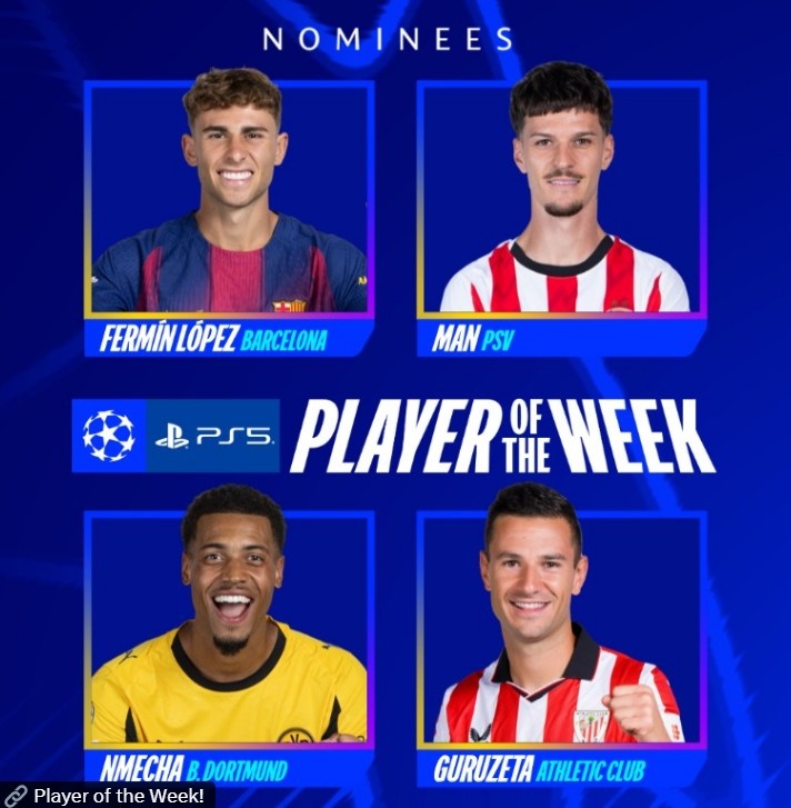 The official candidates for the best player of this round of the UEFA Champions League: Fermin leads the way, Nmecha and Denis Mann are on the list
