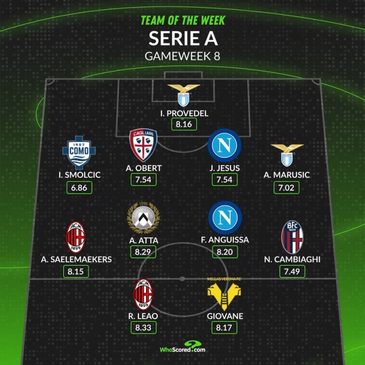 The 8th round of Serie A has been completed, and whoscored has also listed the best lineups for this round. Milan, Lazio and Naples have 2 finalists each.